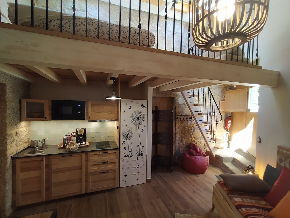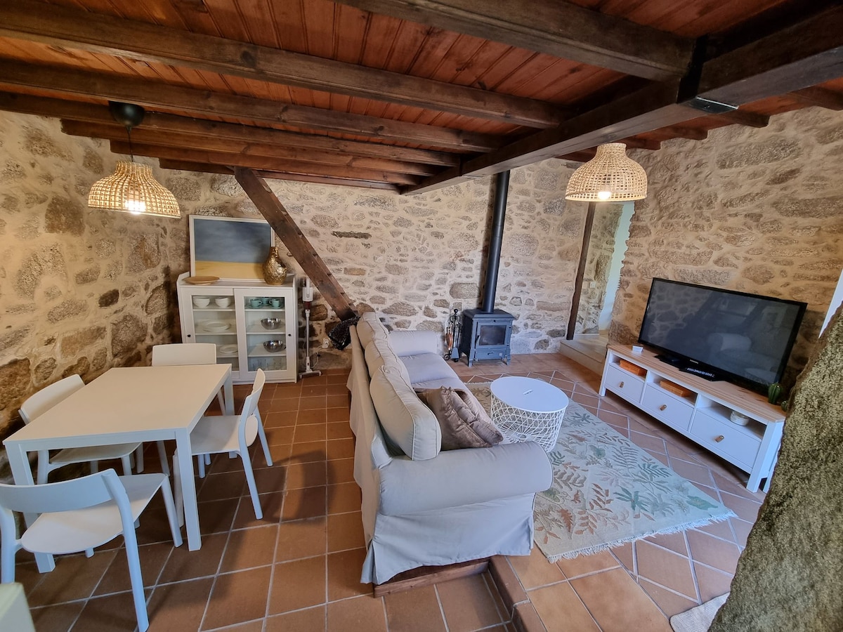 Casita de piedra restaurada a menos de 10 minutos de Santiago, 25 de Noia, 40 de Sanxenxo o Ribeira y 1 hora de Finisterre. Capacidad para, máximo, 4 personas, habitación con cama de 160 cm y altillo abuardillado con cama de 150 cm. Baño con ducha, acumulador de 100 litros. Cocina equipada, menaje, inducción, nevera, tostadora, cafetera, horno, etc. Terraza privada con sillas, mesa, barbacoa y un hórreo. Aparcamiento privado dentro de la propiedad, y exterior. Estufa de leña + AACC.