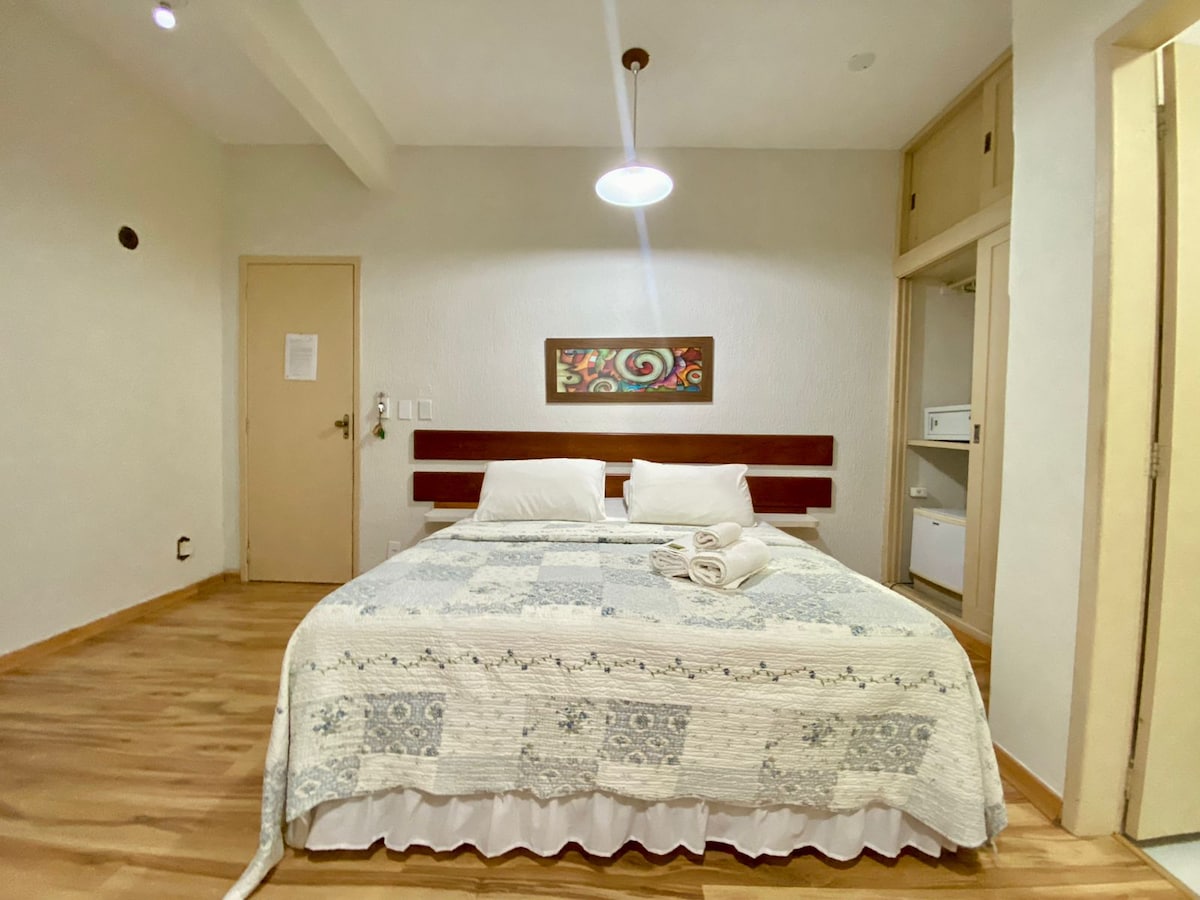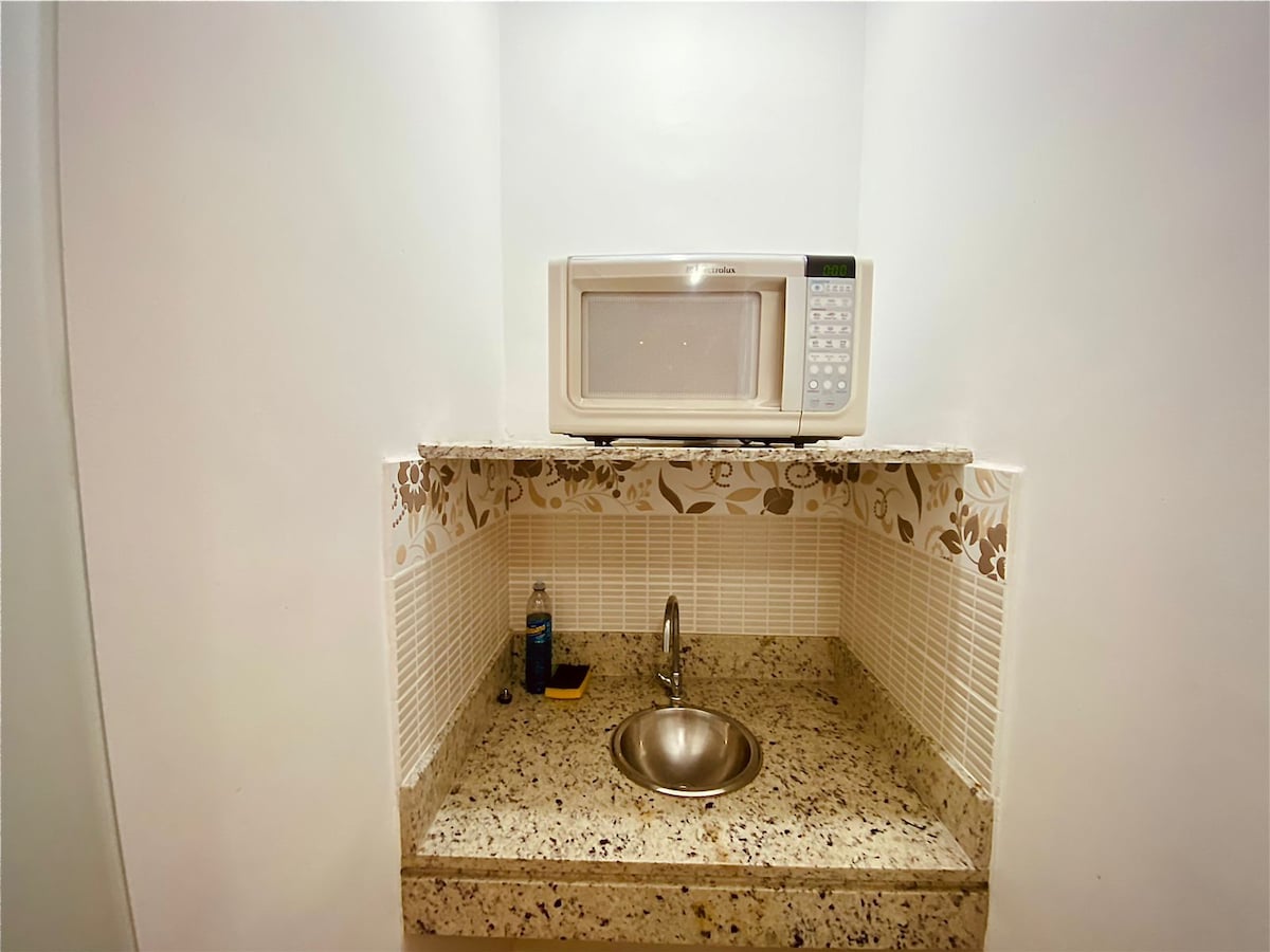 Flat novinho a 4 quarteirões da Praia do Forte em Cabo Frio, com tv, ar condicionado, cama Queen e bicama, ventilador de teto. Pequena cozinha com microondas, frigobar, utensílios, cafeteira e sanduicheira. Oferecemos lençóis 200 fios, travesseiros e toalhas de banho. Super bem localizado, perto de bancos, mercados, padarias e principais restaurantes. Bem no centro da cidade.