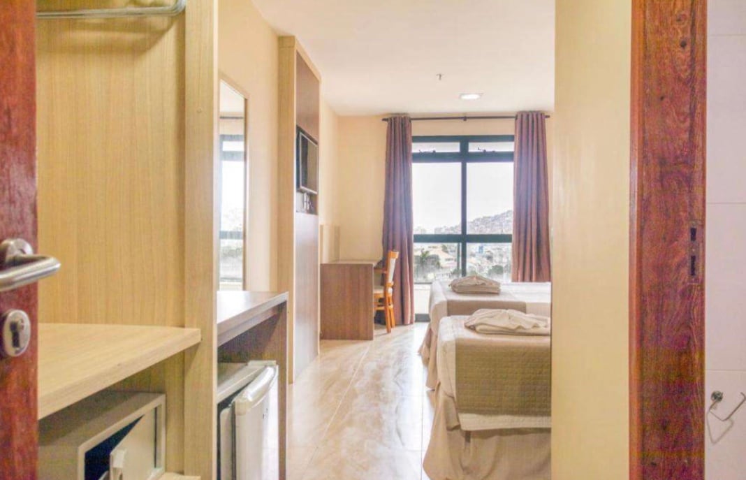 tudo novo! cofre,espelhos,roupas de cama de alto padrão ,finamente decorada acomoda casal ou 2 solteiros e tem uma cama auxiliar. as dependências do hotel são ótimas com restaurante, bar,piscina, sauna academia e agora com estacionamento grátis a disposição. colocamos na TV um cabo HDMI conectado para seu notebook ou streaming ,no frigobartem bebidas que pode ser pagas no QR code e o mesmo para o cafe expresso!.. estacionamento grátis dentro do hotel. faremos de tudo para sua estadia ser top!