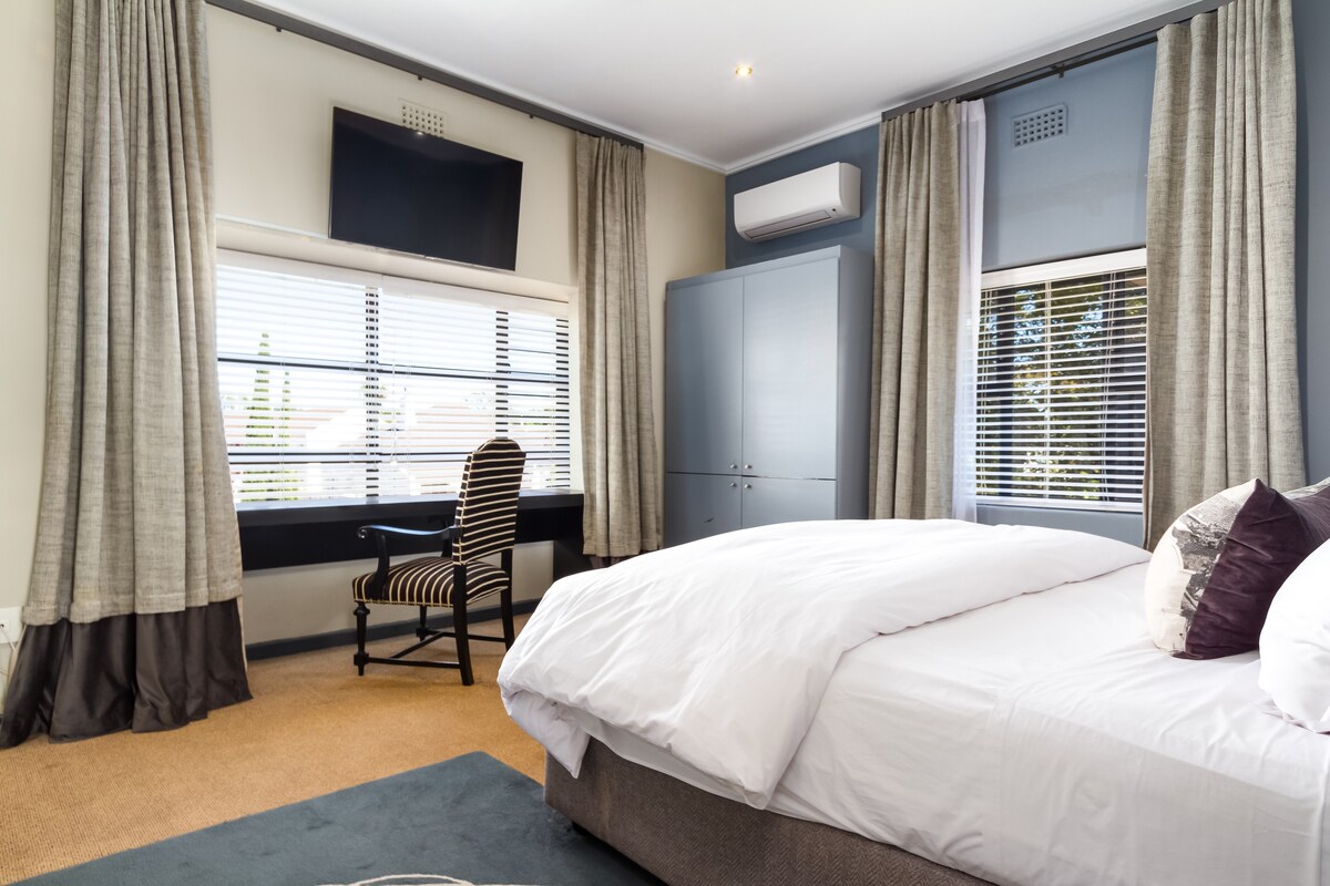The accommodation is in the historic Broadlands Manor close to beaches, wine tasting venues and shopping malls. The Lindeman room is named after one of Lady Kenmare's husbands from the famous Australian Lindeman fame. The room is tastefully decorated and you will be spoiled with the best quality Egyptian cotton bed linen. The second bed is a double and situated on a mezzanine floor. It is only for the use of children age 6 to 16 yrs old.