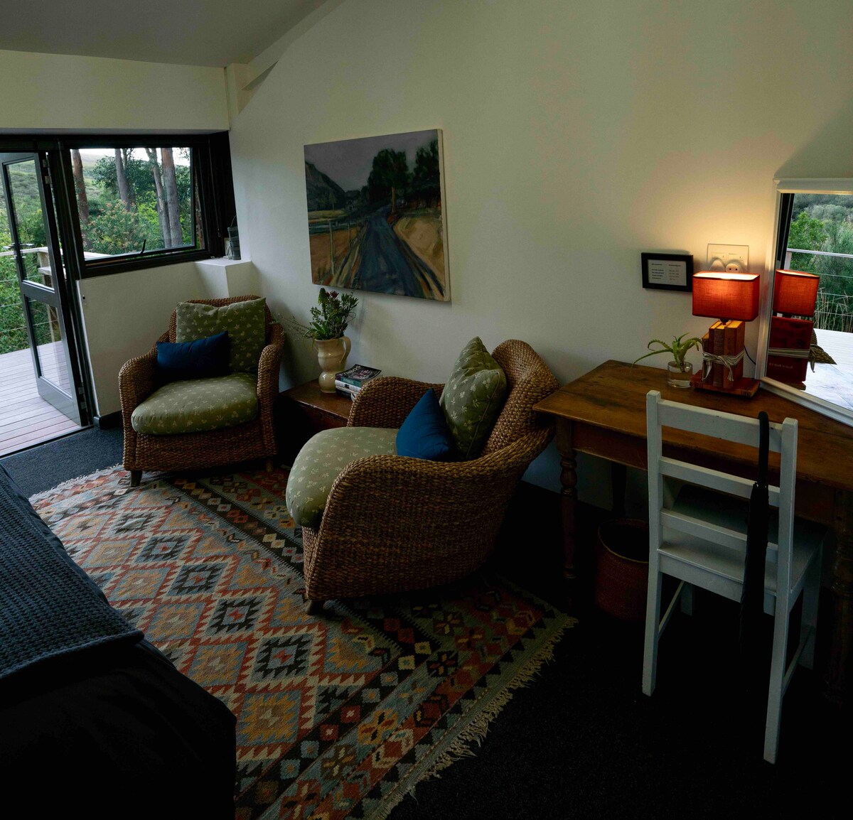 Down to earth and close to nature The Studio Loft is a private, spacious, light and airy open plan with a relaxed atmosphere. A deck towards the South with breathtaking views of the ocean and a patio table with benches for dining Al Fresco. The Northern veranda is sunny with a dramatic view of the mountain and waterfall. Rod's trail starts just a few meters away and takes one through the heart of the Cape floral kingdom to the Botanical garden.