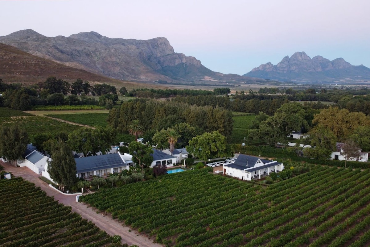 Nestled in the tranquil Robertsvlei valley in Franschhoek lies our luxury vineyard suites with picturesque views of La Roche Estate, Robertsvlei Road. 5km away from the centre of Franschhoek and surrounded by many mountain biking/ hiking trails, as well as wine farms. Each suite has its own private wood-fired hot tub, fireplace and a welcome basket with bubbly for you to enjoy in this tranquil setting. Breakfast is included.