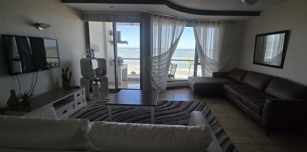 3 bedroom luxury beachfront apartment with views and all amenities you need for a perfect holiday. The apartment has 3 bedrooms, a spacious open plan lounge and dining area and 2 bathrooms. You got views from everywhere and the building got an indoor swimming pool, a steam room, 2 safe parking spaces as well as amenities like bakery, restaurant, spa, convenience supermarket. You can sit outside on both sides or there is a braai room which is covered from the wind. The building got good security.