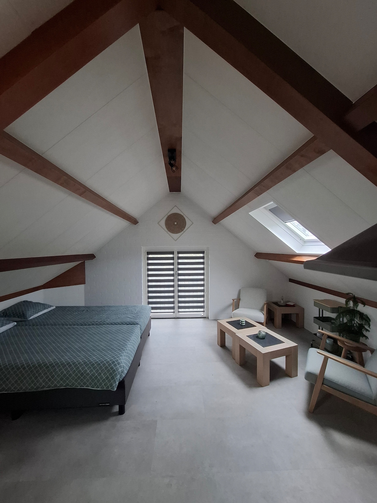 De Tuinkamer heeft super veel ramen die uitkijken op de tuin. Een heerlijke ruimte om te zijn met een aparte slaapkamer. De badkamer bevind zich in de hal. ( hier is ook de entree van 1 ander appartement met eigen badkamer) In de woonkamer is een eettafel met stoelen, een zithoek met een grote bank en een keuken met koelkast. Koffie en thee staan klaar. De ruimte is hoog en er is een trap die naar beneden kan zodat de vide gebruikt zou kunnen worden. Op aanvraag is hier voor 2 personen plek.