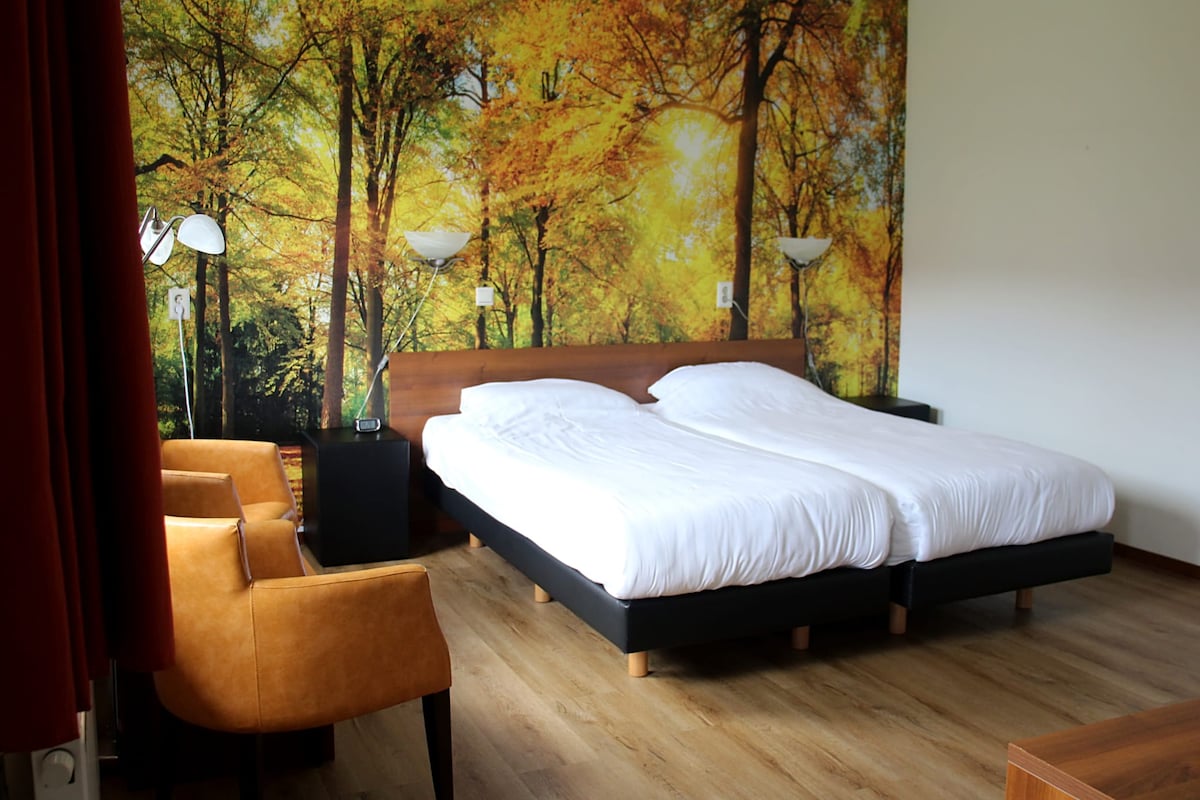Private entrance on the ground floorSleeping / living room with 2-person seat & 2 luxury box-spring beds.Desk, minibar and kettle, flat screen TV / DVD player,Alarm radio, cupboard with safe and hair dryerLuxurious bathroom with bath, shower, toilet and sink.2 seater outside in front of the hotel room.Free internet and option for breakfast buffet (to be booked in advance)