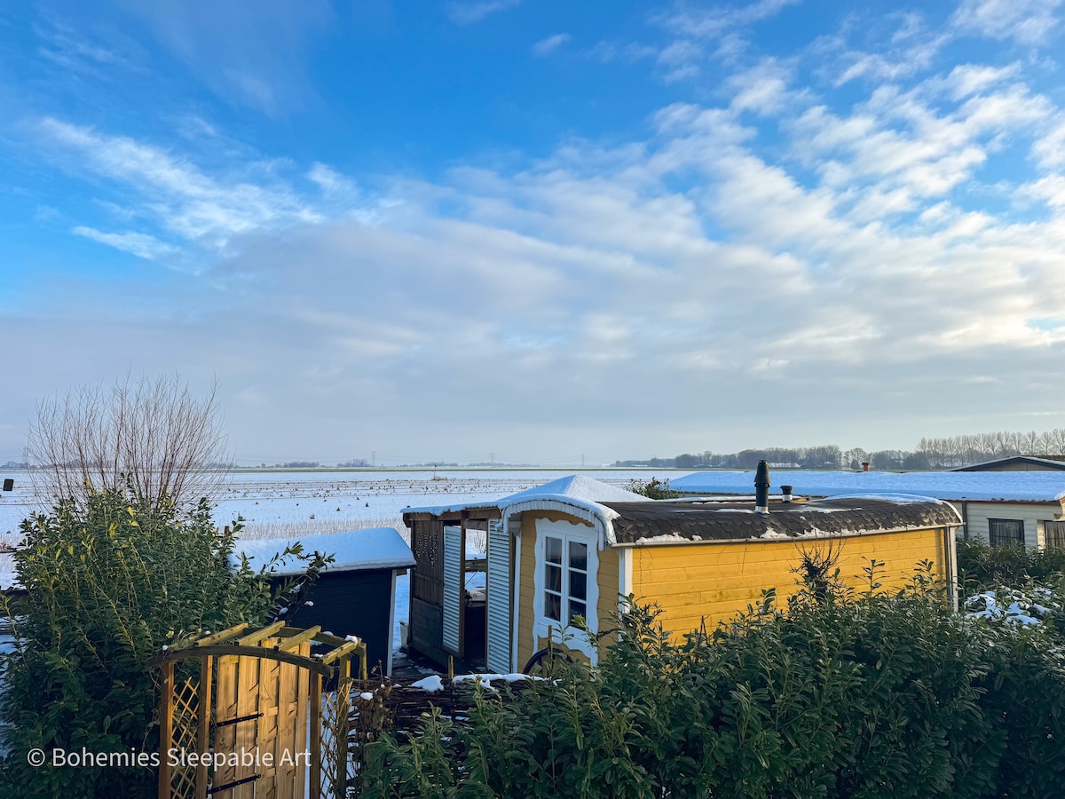 Kaatje Kakel is de naam van onze gezellige gepimpte caravan voor 1-2 p. in Blesdijke met op 20 meter jouw eigen sanitaire ruimte met een douche, toilet en een klein aanrechtje. Op het gras bij de caravan kun je een kleine tent opzetten zodat je ook met 3-4 personen kunt verblijven op dit mooie plekje. Neem hiervoor even contact met ons op. De caravan heeft een heerlijk tweepersoonsbed en bevat alle basisvoorzieningen zoals bedlinnen een een kacheltje. Voor de caravan is een fijn terras.