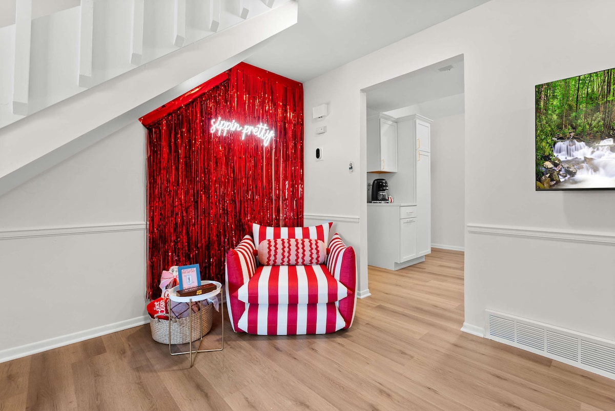 Unwind at this art-filled, newly renovated townhouse minutes from restaurants, shopping and entertainment. Two king bedrooms with smart TVs make for a great getaway for two couples or a small family. Enjoy the fully-equipped kitchen or grill on the private patio. The basement serves as a lounge and office space and is equipped with a TV, sofa, desk, laundry room and full bath. Walk to the community pool or hit the courts for a game of basketball, tennis, or pickleball with provided equipment.