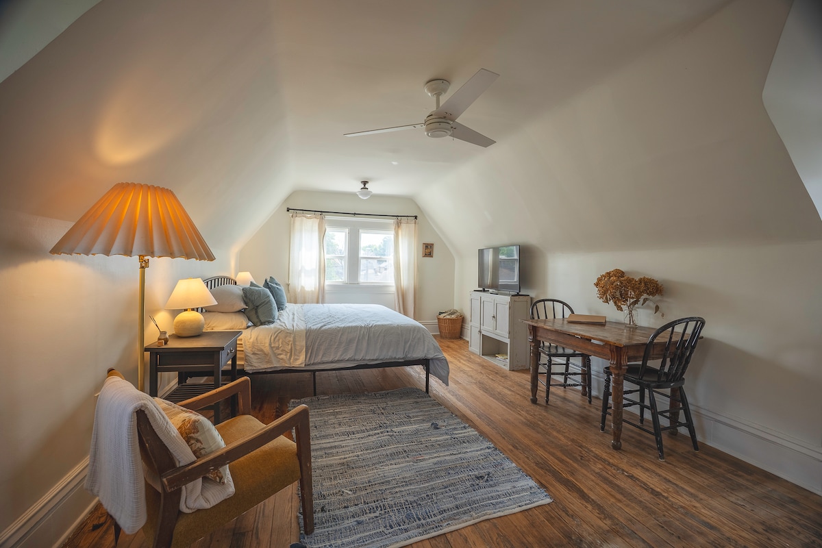 Enjoy this bright, spacious, amenity-packed suite just minutes from The Plaza, Westport, Crossroads, and Downtown. This second floor suite has a parking area behind the house. It's best for cars and smaller SUVs, but most trucks and SUVs can get by also. This guest suite on the upper floor offers a king and twin bed, large bathroom, and sitting room with a breakfast nook. Guests are provided special amenities such as a bidet, toaster oven, mini fridge, electric kettle, and ice maker.