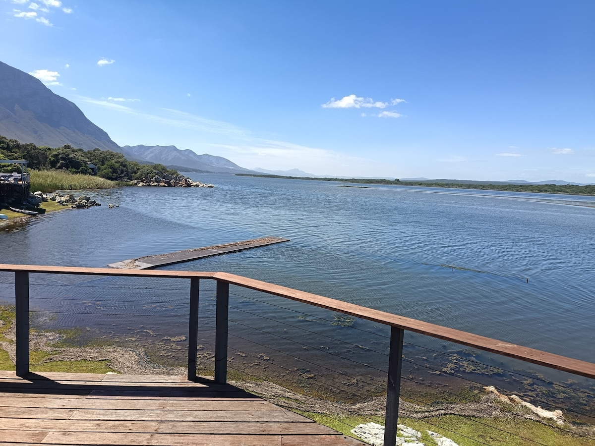 Moonshine cabin, located on the banks of the Klein River Lagoon, Hermanus, is a much loved home, filled with happy memories. The cabin has a spacious open plan living area with WiFi, air conditioner and tv in the lounge. The living area leads out to a deck, with a seating area and braai. The cabin sleeps 6 guests. The main bedroom has a queen sized bed with views and ensuite. The second bedroom has a queen and a single bed. The third bedroom is a single. There is a kayak for guests to use.