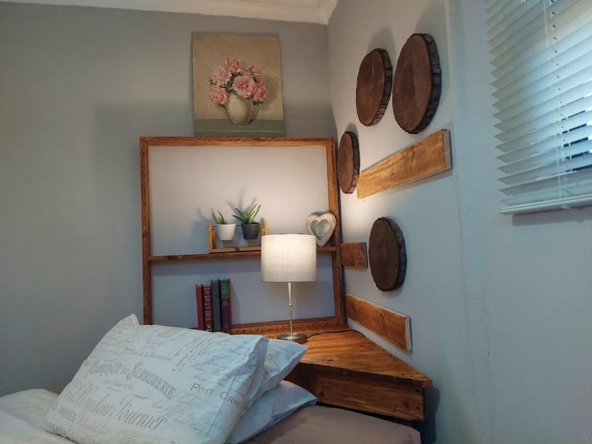 Our quaint, sunny, self-catering, fully enclosed Garden Cottage comfortably sleeps 2 adults in an open plan studio bed/sitter with king or twin beds. There is a fully equipped kitchenette and outdoor braai/barbeque area. A small bedroom sleeps 2 kiddies on single beds. The bathroom has a walk in shower. Electricity power backup. There is a wood burning fire place for cosy winter evenings. Walk to town, restaurants and our famous seafront cliff paths. Of street parking and free fibre Wifi.