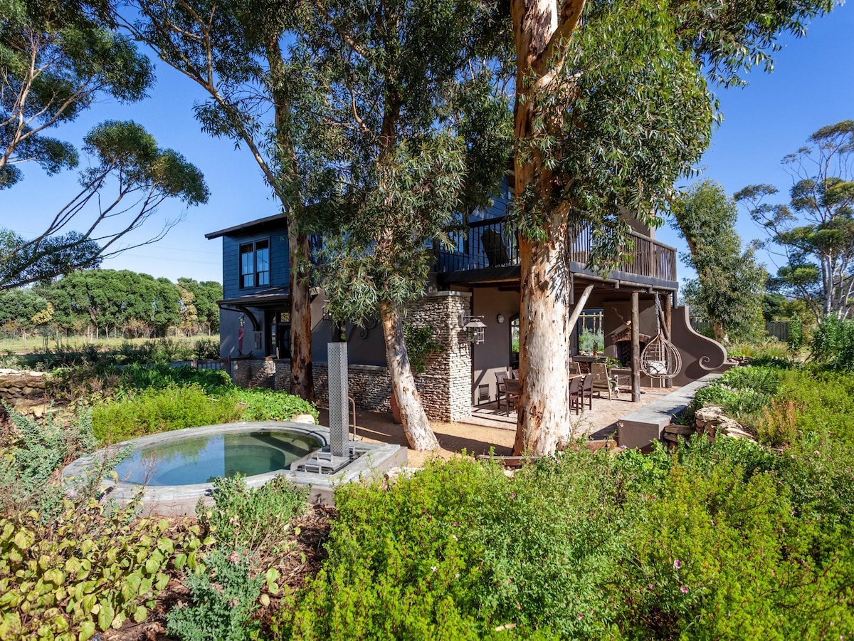 Once a milking shed for the de Villiers Jersey herd, Melkstal is now a luxury two-bedroom guest house with fynbos, mountain, and dam views. Features include a king room, twin room, open-plan living with fireplace, and a fully equipped kitchen.
