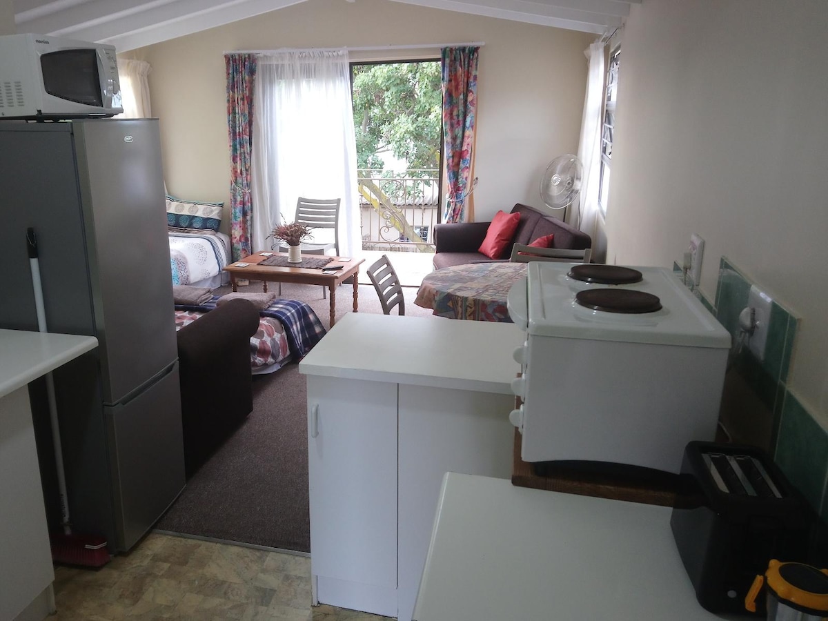 Our quaint, sunny, self-catering, fully enclosed Garden Cottage comfortably sleeps 2 adults in an open plan studio bed/sitter with king or twin beds. There is a fully equipped kitchenette and outdoor braai/barbeque area. A small bedroom sleeps 2 kiddies on single beds. The bathroom has a walk in shower. Electricity power backup. There is a wood burning fire place for cosy winter evenings. Walk to town, restaurants and our famous seafront cliff paths. Of street parking and free fibre Wifi.