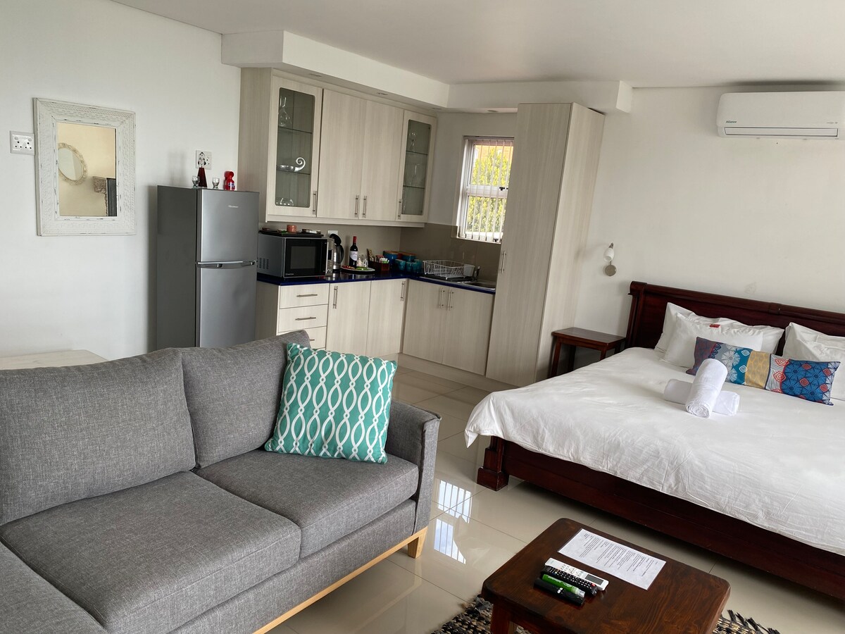 A charming open-plan cottage, nestled near the cliff path and whale-watching lookouts of Hermanus. The freestanding Cottage is situated at the back of a permanent private residence with its own entrance. There is a cosy living area and comfortable seating. It's the perfect spot to unwind after a day of exploring. Adjacent to the living area, you'll find a well-equipped kitchen. No need to worry about loadshedding.