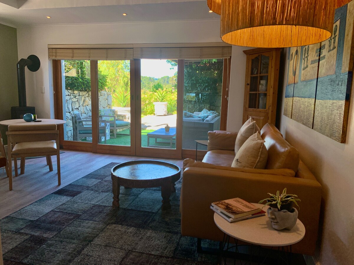 Anzan Farm, Sunbird cottage: Take it easy at this unique, tranquil farm getaway on the waters edge. Self catering cottage for a couple.Spacious lounge with indoor fireplace , well equipped kitchen and large patio with gas braai. The cottage has a hot tub, with lake and mountain views. Enjoy the bird life,peace or be active swimming, canoeing and fishing in the lake.Elgin offers nearby wine farms,cycling routes, horse riding, hikes, zip lining and plenty more. No pets allowed. 6 kms dirt rd