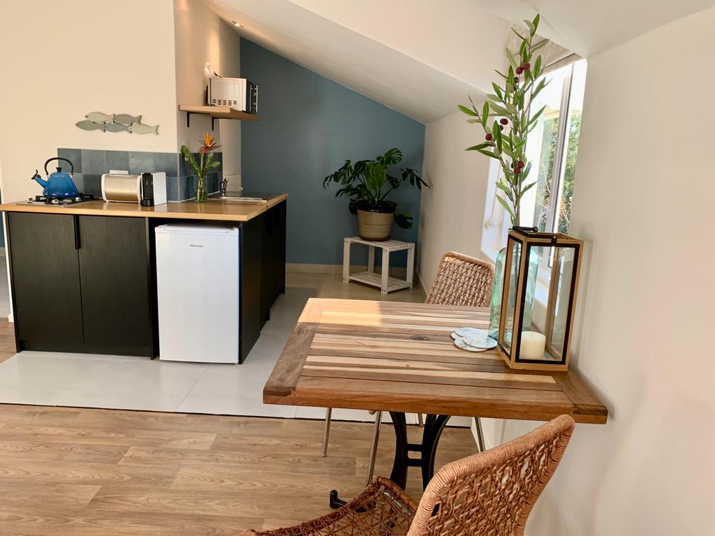 The apartment is situated away from the other villas and can be reached by climbing stairs. It boasts a king-size bed, en-suite with shower only, a seating area, and a fully equipped kitchen. Additionally, it comes with a private deck and Jacuzzi.