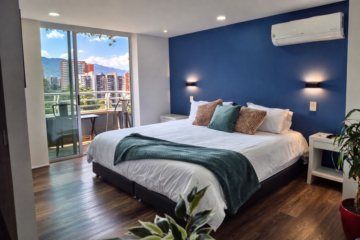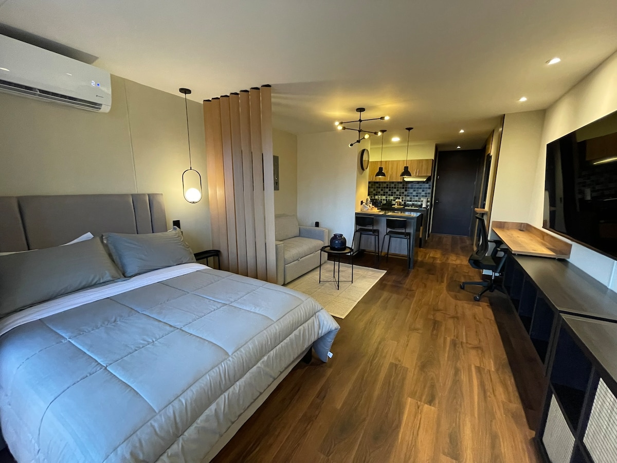 Moderna suite completamente amueblada, cocina, baño privado, 1 cama queen y un sofá cama, 500 MB de internet, aire acondicionado, escritorio, comedor y espectacular vista a la ciudad. El edificio está ubicado en el mejor barrio de Medellín, El Poblado, cerca de la Universidad EAFIT, la Milla de Oro, centros comerciales, supermercados, restaurantes y la estación Aguacatala del metro. Cuenta con zona de coworking, café, gimnasio, minimercado, spa y vigilancia las 24 horas.