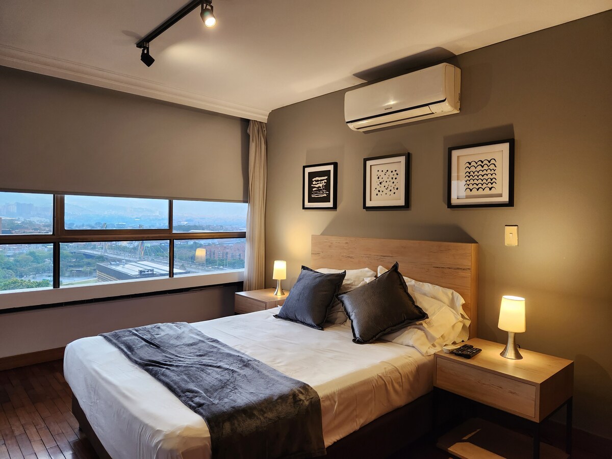 Beautiful new apartment with wide views of the city and its mountains, located in one of the most exclusive neighborhoods of Medellín, Located close to the Eafit University, in a very quiet place, close to Parque El Poblado,Parque Lleras, metro station, grocery stores .Equipped with everything you need to enjoy a pleasant stay. It has a small kitchen with the necessary implements; air conditioning, 200mbps internet, smart TV, private bathroom, large window and more