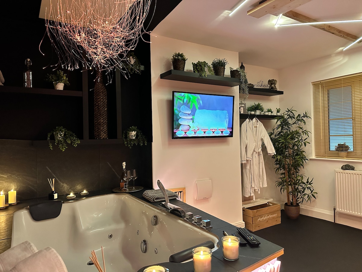 Visit London with Your Own Private Spa! 5min walk from Underground Station-30min to City Center. Double Jacuzzi bath for romantic time with your Love one as well as shaped for two Sauna with Aromatherapy equipment. 42" TV for Bath and Sauna. Bedroom designed to fit everything you need as a couple to spend perfect time together. There is a 7:1 Cinema System with top spec speakers located for dolby surround and 72" screen +4K Smart Projector. Fully equipped for memorable stay+ ;)