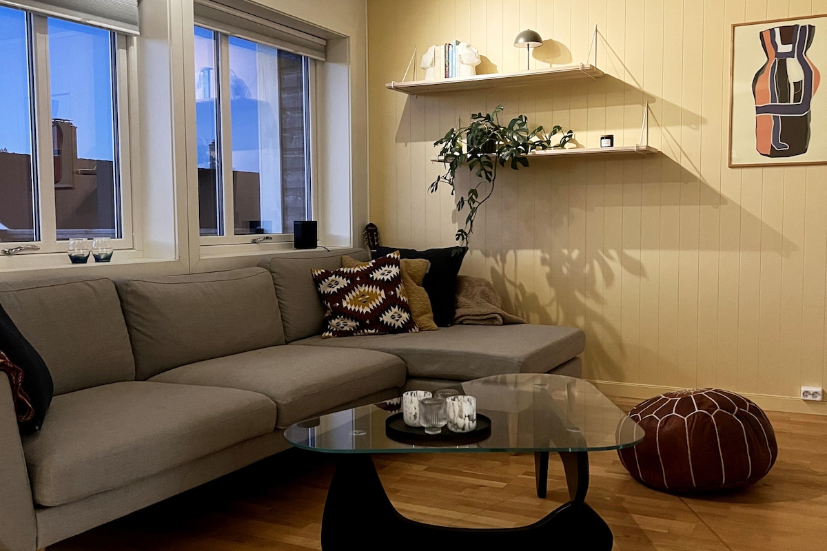 På dette stedet kan familien din bo i nærheten av alt, beliggenheten er sentral. Rolig boligområde, men kan være noe støy fra jernbanen, egen uteplass. Standard er helt middels, lite bad men inneholder både dusj, toalett og vask. Bad har inngang fra det ene soverommet. Er man fler en tre stykk så må en eller to ligge på stua i oppredde senger. Uteplassen er liten men plass til fire rundt et bord. I hagen er det en stor trampoline til disposisjon. Sengetøy og håndklær er inkludert i leien.