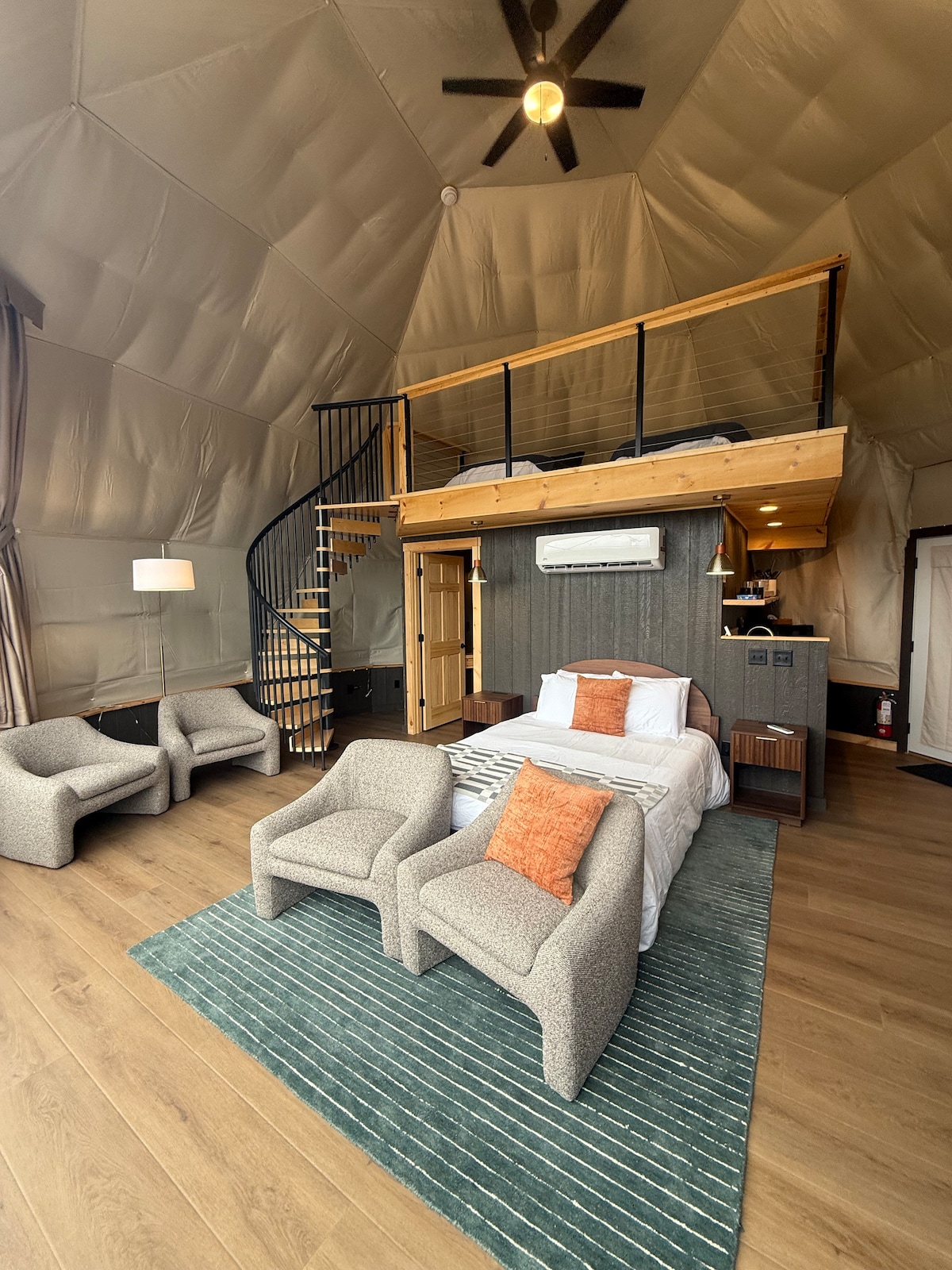 Escape to this unique glamping dome just 8 minutes from the Ark Encounter! Enjoy nature without sacrificing comfort! Perfect for couples, families, or solo travelers looking for a cozy, one-of-a-kind stay. Relax, recharge, and stargaze in style! What You'll Love: • Just 8 minutes from the Ark Encounter • Queen bed + 2 twins in loft • Kitchen ft. cooktop, sink, mini-fridge, • Private bathroom with hot shower • AC & heat • Fire pit with outdoor seating