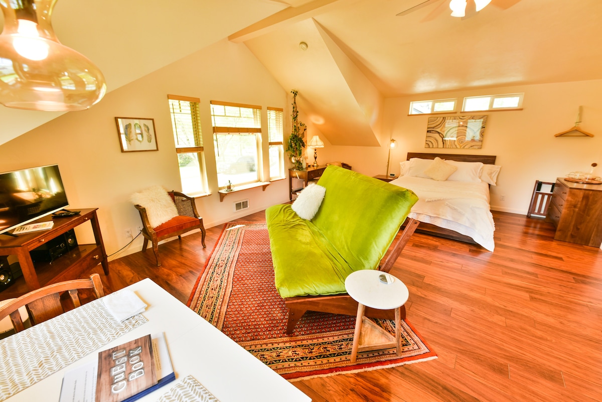 Cozy up in this sunny studio located in the Friendly neighborhood. Snuggle up in the comfy queen bed by the gas fireplace. A wine fridge chills your food and beverages. A private full bathroom—separate from the studio—is accessible by a 40-foot lighted and partially covered walk to the garage. Enjoy the quiet back yard, patio, and garden. Restaurants, shopping, and parks are within a short walk. We welcome up to two well-behaved guest dogs with responsible owners.