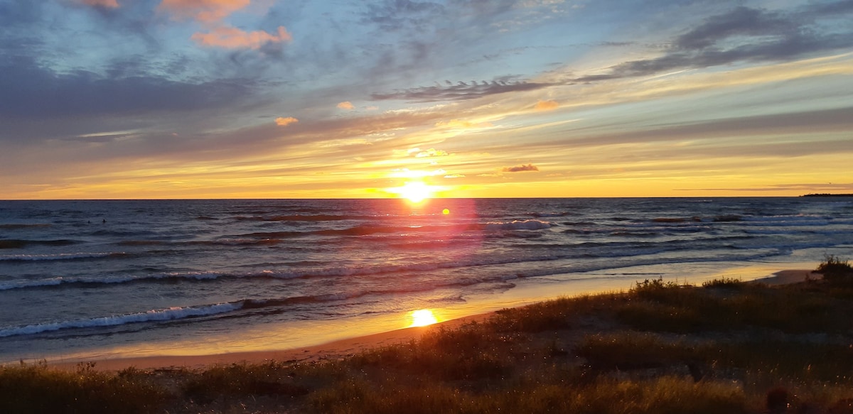 Insta: @woodwardbythebeach 3min walk to the area’s most beautiful beach, sunsets & trails, you'll be sure to get lost in the serenity of the sand dunes year round Outdoor fire pit- s'mores included! Enjoy the BBQ, deck, & patio; the wine is on us! Fast WIFI for streaming movies or work from cottage Area is secluded yet central. 10min to Midland, close to Balm Beach - arcade, gokart, restaurant, & bar Ski/Hike/Snowmobile then unwind in a peaceful winterized home getaway with indoor fireplace