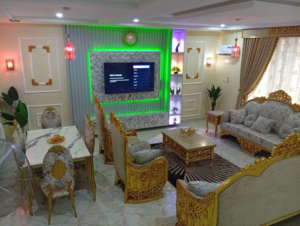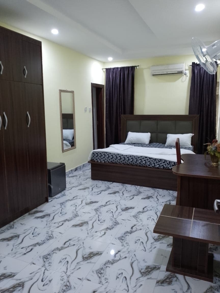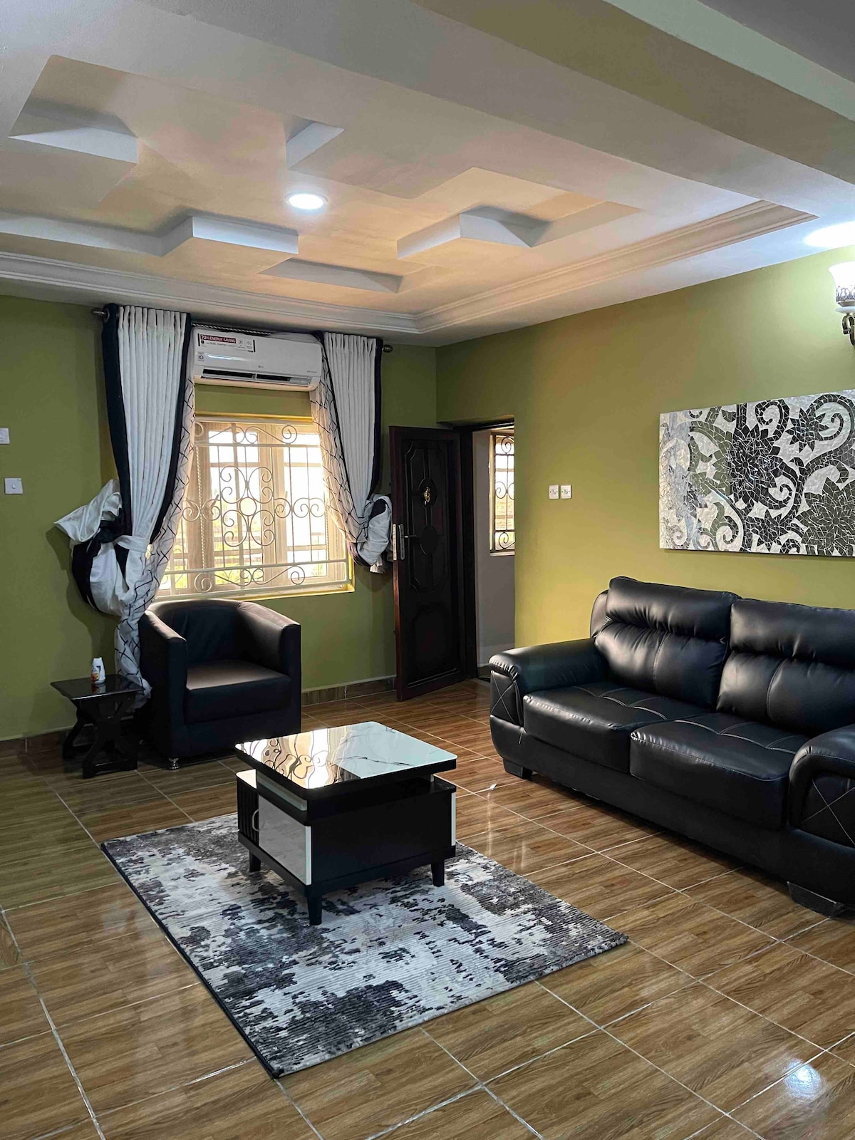 This cozy apartment features one bedroom with classy wardrobe and fans Sitting room with television air condition fans and work place Modern equipped kitchen with gas stove fridge freezer toaster kitchen utensils and microwave Bath room with shower situated in a gated community and built in a gated spacious compound with free parking and renowned security Provision for three exterior cameras supported with flood light .Solar powered 24 hours coolness backed up with 40 KVA generator.