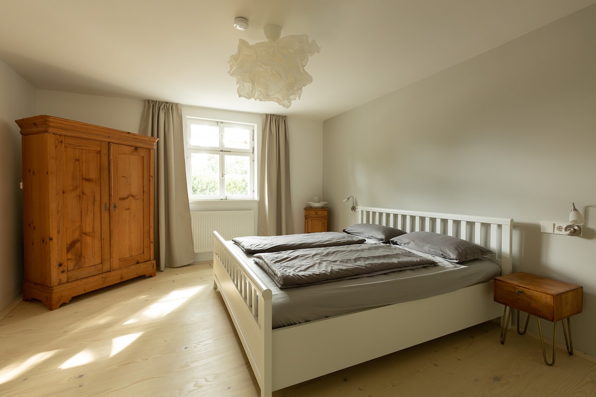 Sie wohnen gemütlich und authentisch auf 24qm in unserem "Bauernstüble". Im Wohnraum befindet sich eine Essecke, ein Kleiderschrank, Sofa und Satelliten-TV. Über eine Treppenleiter gelangen Sie in den Schlafbereich mit einer 140x200cm Matratze. Angrenzend zum Eingangsbereich befindet sich eine kleine aber vollwertig ausgestattete Küche. Ein modernes Badezimmer mit Fußbodenheizung und Tageslicht rundet die Wohnung ab. Eine Waschmaschine + Trockner kann für 4€ pro Waschladung mitbenutzt werden.