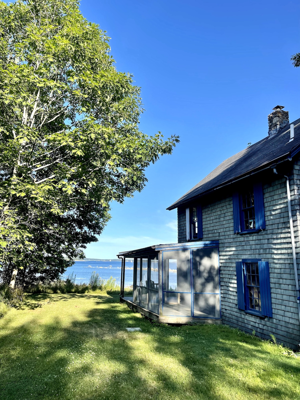 Spectacular cottage on Penobscot bay in Belfast. The cottage is focused on the views from the great room and screened porch. You’ll love the spacious, clean, open cottage with a complete kitchen and propane fireplace. Sit on the porch with a book/glass of wine and watch for seals and schooners. Easy access to the shore along a gradual path and short boardwalk. Great amenities and comfort for vacationers both young and old. Perfect for couples and families (with kids).
