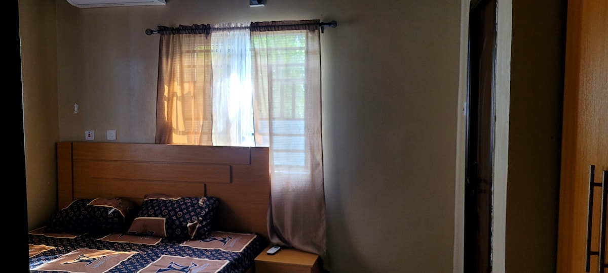 Priced for long stay, fibre internet Wifi, three (3) Air conditioners, hot water, Solar Inverter system, secured, large beds, private backyard, private car park, spacious kitchen, children playground, smart TV, neaby trees/wood to collect fresh air and more. Relax with the whole family at this peaceful place. Suitable work space/desk in place. NGN 10,000 worth of electricity units provided on check in, after which guest will be responsible for electricity cost.