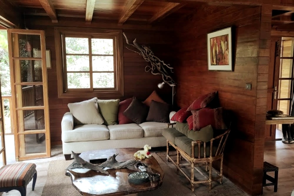Relájate en este espacio tan tranquilo y elegante en contacto con la naturaleza, rodeado de árboles altos y antiguos que cantan con el viento, viendo a las aves, luciérnagas y las estrellas desde nuestras terrazas amplias en cómodas tumbonas acolchadas o desde dentro por nuestros amplios ventanales y mamparas. Cocina cómodamente con todos los artefactos necesarios, disfruta de tus películas favoritas en una amplia sala o trabaja con un WiFi estable a un paso del bosque y 10 min de la ciudad.