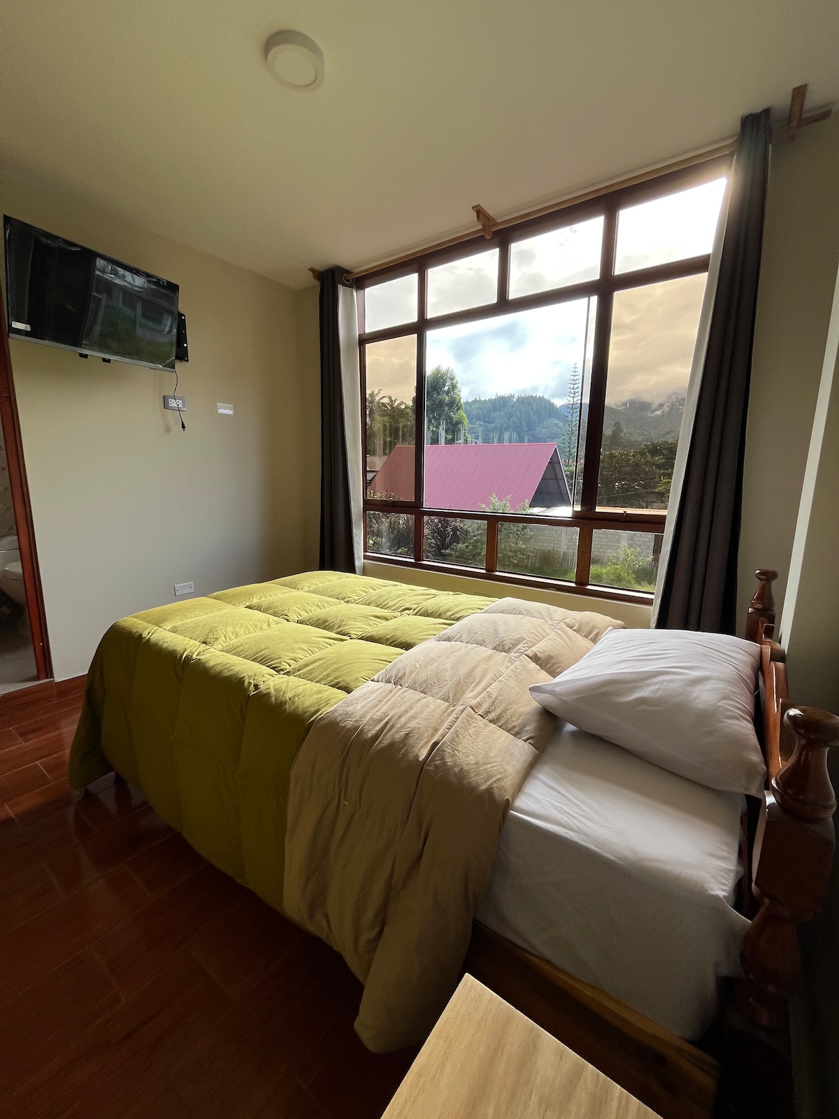 Disfruta de una experiencia con estilo en este alojamiento céntrico y a la vez en el bosque conectando con la paz de la naturaleza y a minutos de la plaza central. Vas ahorrar tiempo y combustible. • Baño con agua caliente • 2 habitaciones con 3 camas • 2 camas de 2 plazas y 1 cama de plaza y media • Terraza con vista al bosque y parrilla • wifi • Sala comedor • cocina equipada • 2 televisores también vas apreciar la variar de aves, ardillas y monitos que nos visitan de la naturaleza.