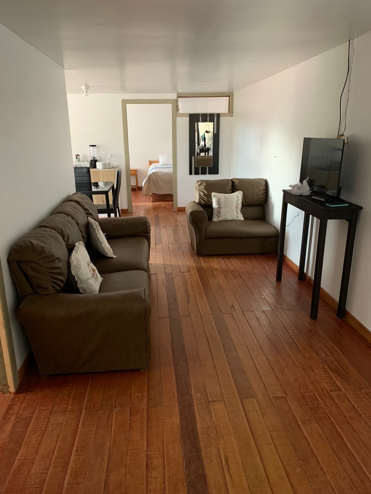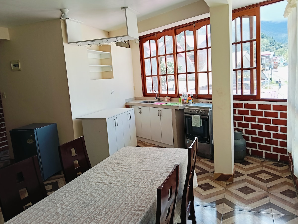 El mini cuenta con 1 habitación amplia donde hay 3 camas separadas en diferentes direcciones ( 1 de dos plazas, y 2 de plaza y media). Además 1 sala comedor, cocina y lavadero, baño privado. También una lavandería independiente con llave y balcón privado. Es muy acogedor.