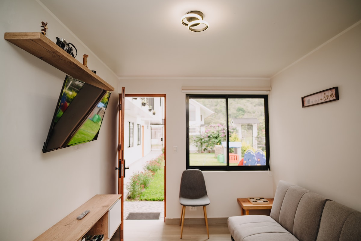 Disfruta de una experiencia con estilo en este alojamiento Alpino, céntrico y a la vez en el bosque conectando con la paz de la naturaleza y a minutos de la plaza central. Vas ahorrar tiempo y combustible. • Cocina equipado • Baño moderno con agua caliente • 2 habitaciones con cama de 2 plazas • Sala •Vistas panoramicas •Terraza con vista al bosque • Sendero para caminata • 1 televisor también vas a disfrutar la variar de aves, ardillas y monitos que nos visitan de la naturaleza.