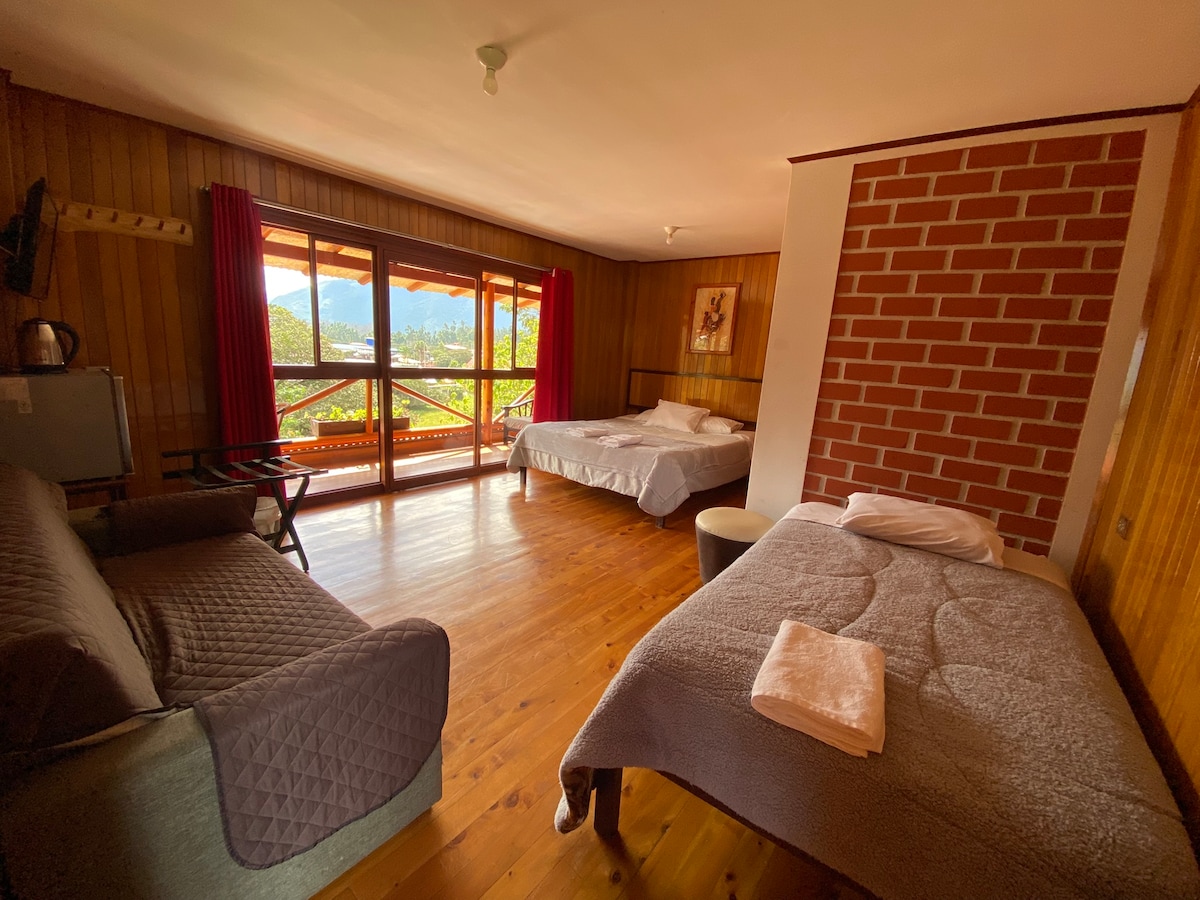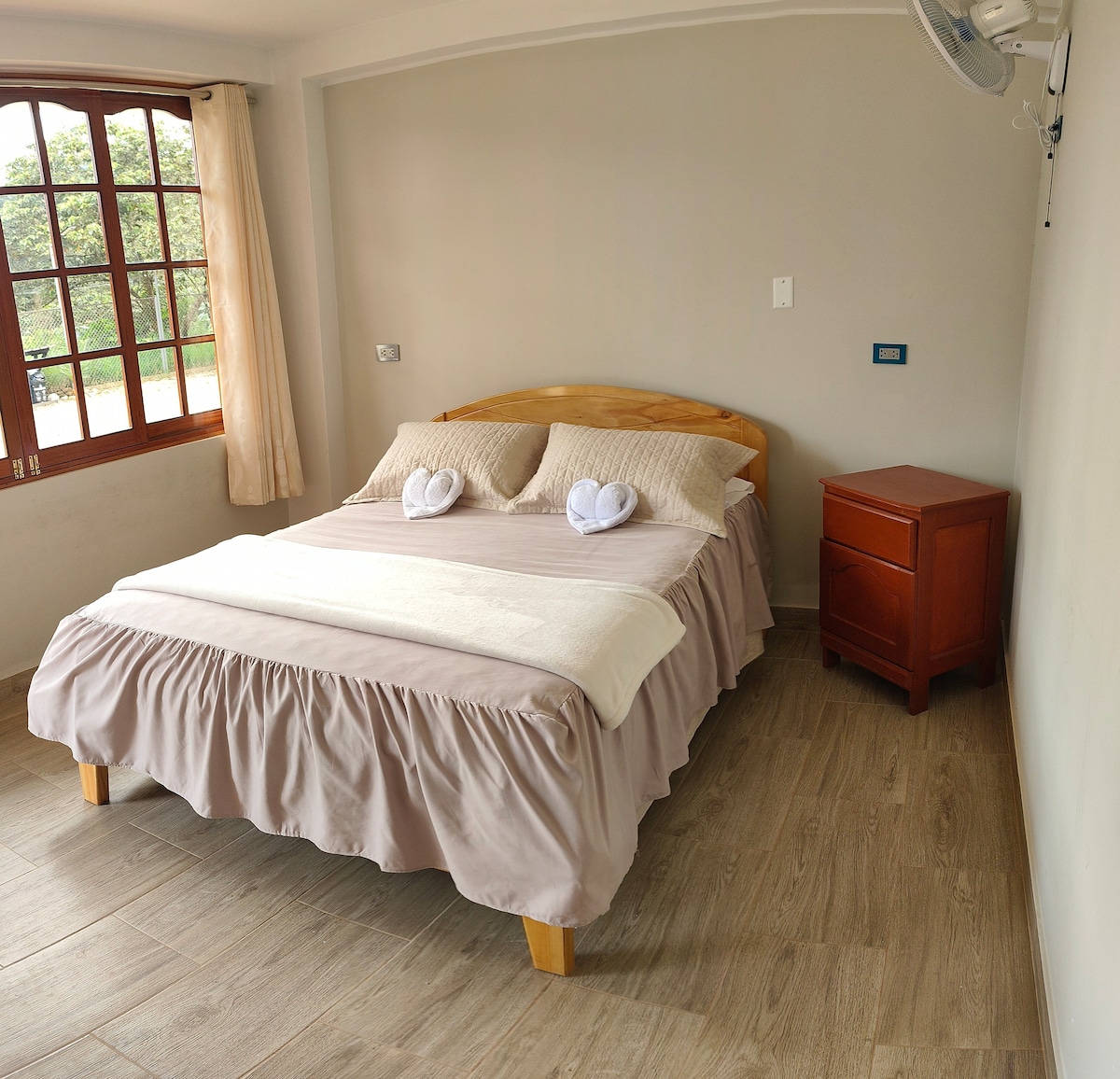 Habitación matrimonial cómoda en hotel tranquilo de Oxapampa, ubicada a solo 5 minutos de la Plaza de Armas. Tiene 1 cama de 2 plazas y 1 de plaza y media. Incluye baño privado, TV y wifi. Los huéspedes pueden usar cocina compartida, estacionamiento gratuito dentro del hotel, área de fogata, parrilla y juegos para niños. Alojamiento pet friendly y ambiente familiar, perfecto para descansar y disfrutar la naturaleza de Oxapampa.