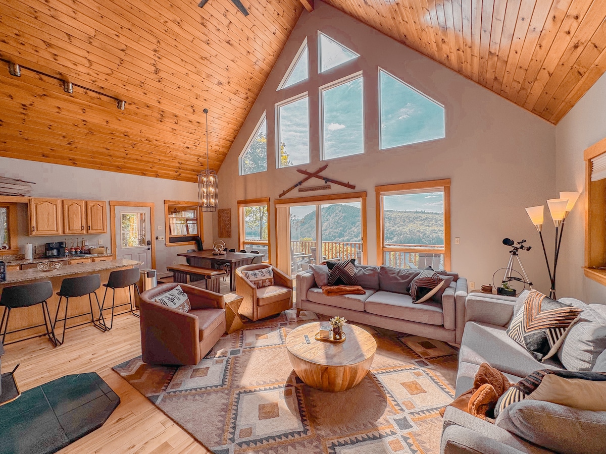14 Acres Secluded A-frame nestled along Clean Crooked River, Hot tub with breathtaking VIEWS and world-class fishing. Swim in the river, private pond or explore hiking trails right from your door. Central AC - Gas Fireplace - Modern Kitchen. Just minutes from pristine lakes, primo golf courses, and thrilling ski slopes, this charming private oasis offers an ideal mix of tranquil relaxation and outdoor adventure. Invite a private chef, florist or yoga teacher to fully unwind. Heated bath floors.