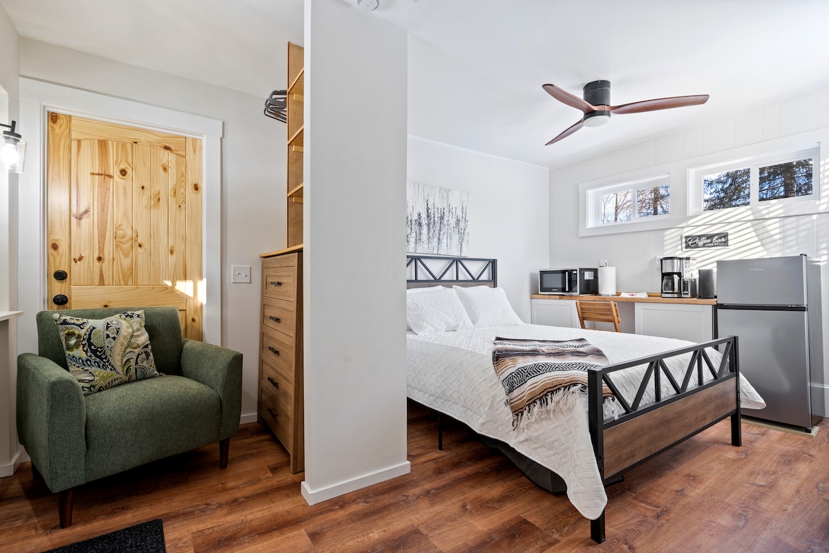 A cozy nest for two! Spend days skiing, hiking, or canoeing on the Androscoggin, then return to our serene space for a hot shower and a drink on the porch. "Maine...the Way Life Should Be!" Our charming, art-filled, minimalist space has what you need to be comfortable, to prepare a simple meal, and unwind. We sit at the outdoor recreation epicenter of the Mahoosuc mountains. However if reading on the back porch is your jam, we also have you covered. One good dog on a case by case basis only.