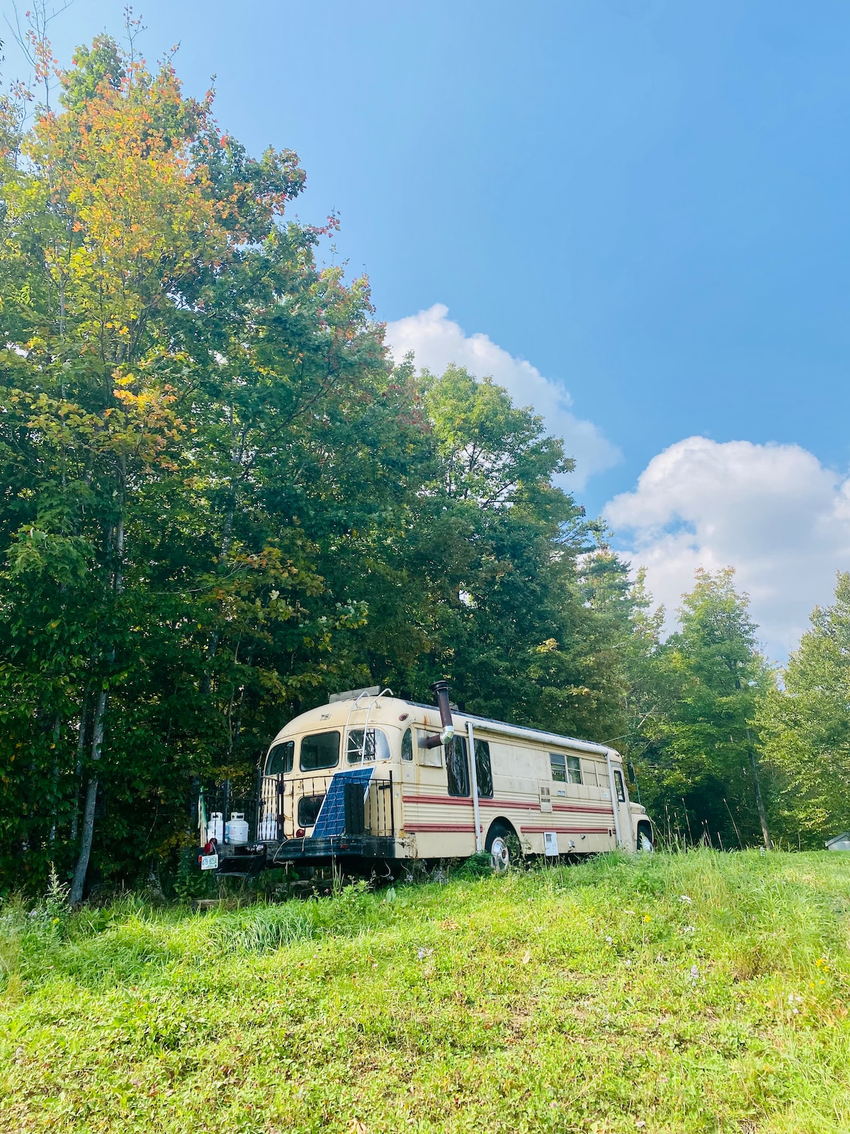 Come stay in this off grid vintage bus  surrounded by nature. It is 1 mile to the closest . It has solar for charging phones and solar lights. This unit is available year-round, but does require access via snowmobile snowshoe in the winter time the woodstove heats up the bus nightly, but takes at least one two hours. There is a compost in toilet near the bus by the bar. This is located in Evans notch, which is an epic spot for hiking fishing and all sorts of recreation