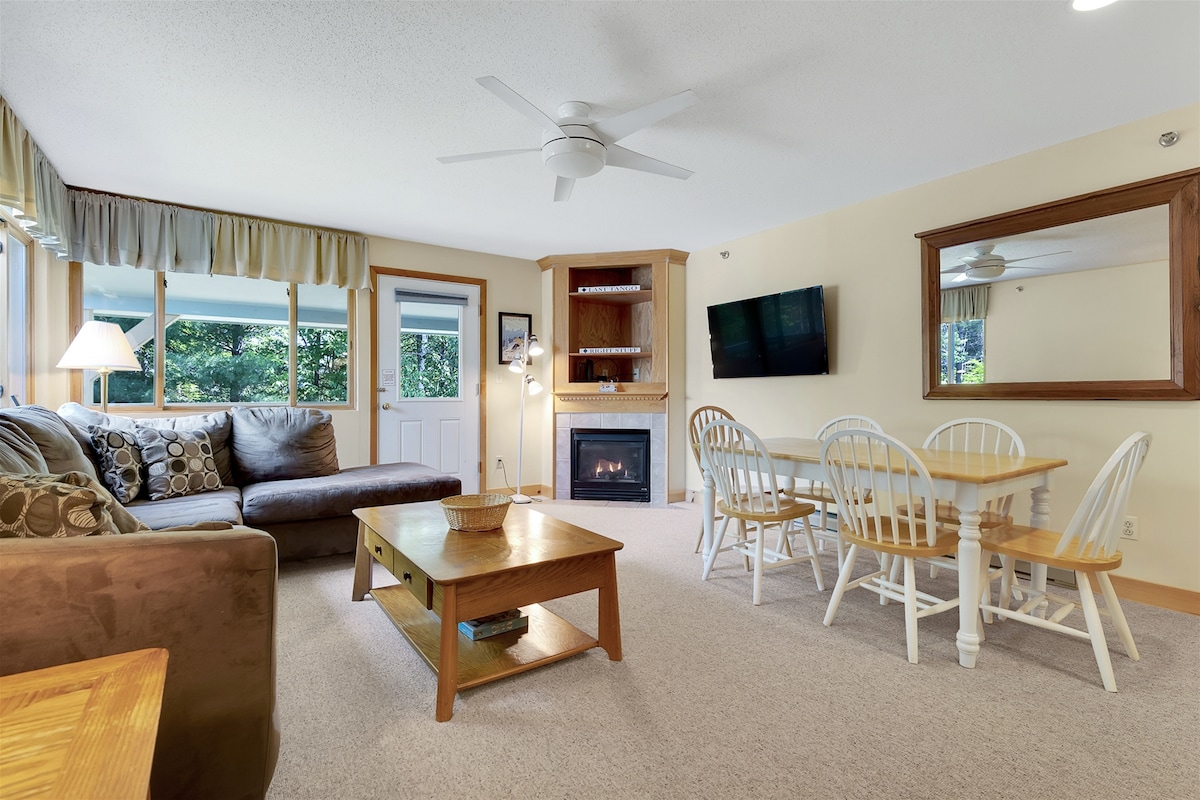 This two-floor ideally located condo is on the mountain between Barker and White Cap Lodges. You can ski in/out using Roadrunner trail, which is right across the parking lot. There is plenty of parking and the condo is located in Building 2, which is closest to the common lodge area with a fireplace and pool/hot tub/sauna access. While this is technically a 1 br, there is a wall between the queen room and the full/twin room for privacy, and a queen size murphy cabinet bed in the living room.
