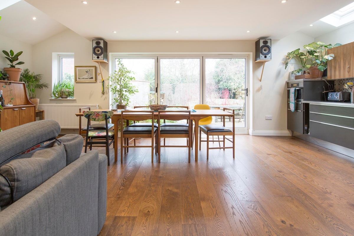 Beautiful house renovated to high standard throughout, with bohemian decor and lots of houseplants and art. This four bedroom house has a large (42 sqm) light-filled open plan kitchen/diner/lounge opening onto a small but perfectly-formed garden. The kitchen and dining/living area can easily accommodate 8 people comfortably. Log burner. Dishwasher. Laundry room. Netflix. Family Games. Please tell us your individual requirements and we will work out the ideal configuration!