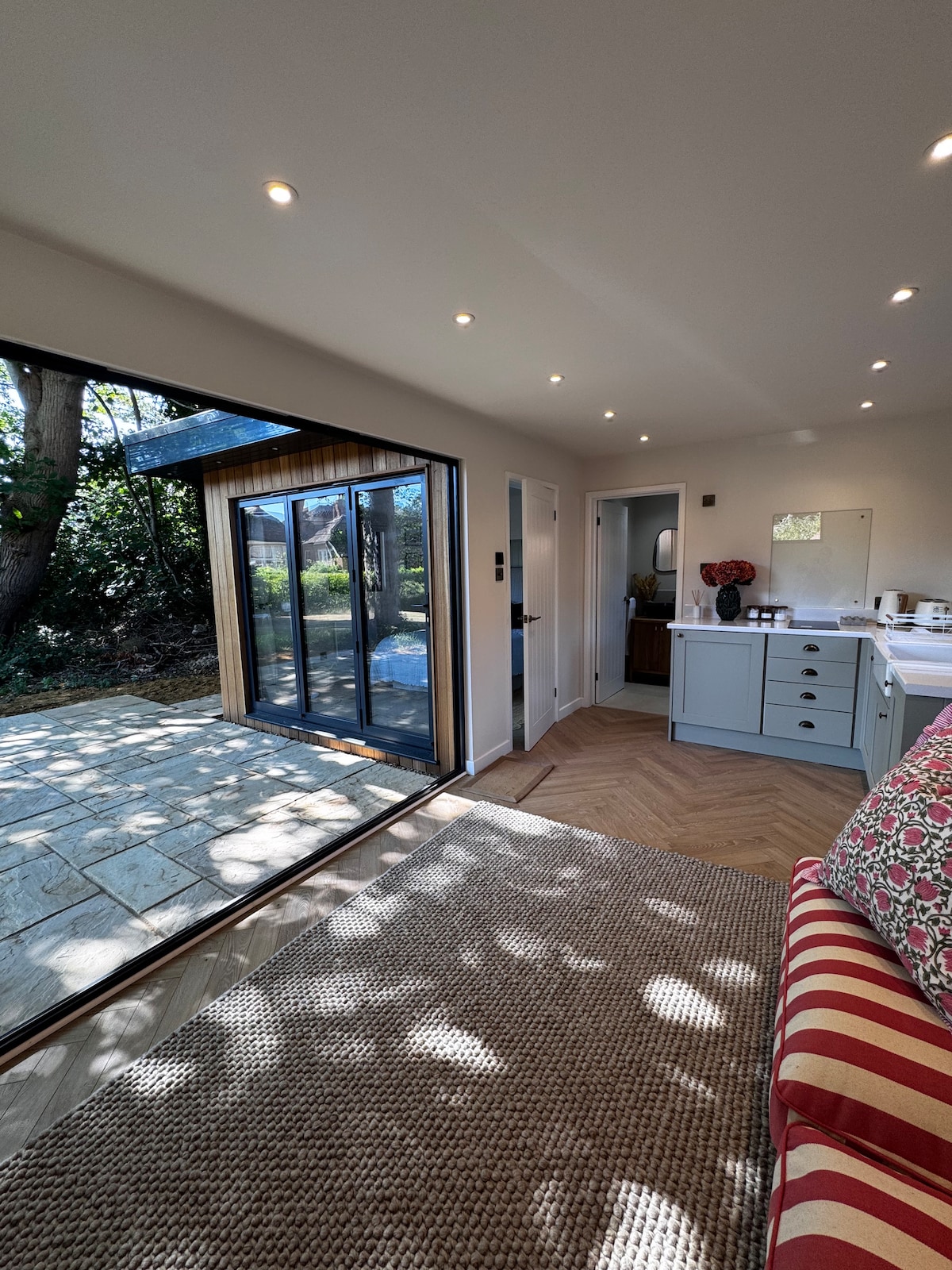 Lovely self-contained annex with breath-taking views over the open fields. Open plan spacious living room and kitchen on the ground floor with a double bedroom with en-suite on the first floor. Short walk to Hanborough train station with great links into London, Oxford and the Cotswolds. Plenty of country walks, pubs and within walking distance to Blenheim Palace.