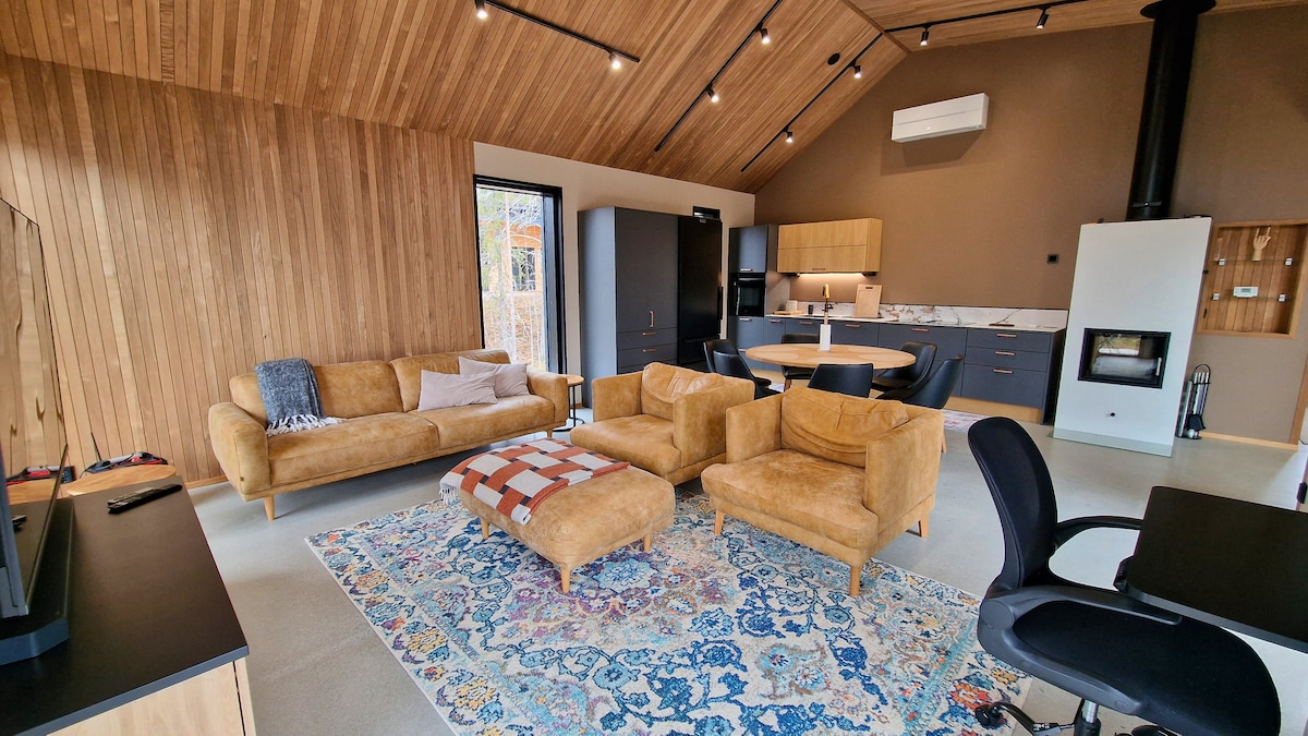 Levin Villa Repo is a modern and stylish log cabin with two bedrooms, completed in December 2023. It spans 80m² and is located in a peaceful setting, directly adjacent to forest and cross-country ski trails. The villa's large windows offer stunning panoramic views of the enchanting nature and forest landscapes. The villa includes a carport and ample parking space in close proximity. Additionally, there is a shared grill hut in the villa village. Free Wi-Fi is available.