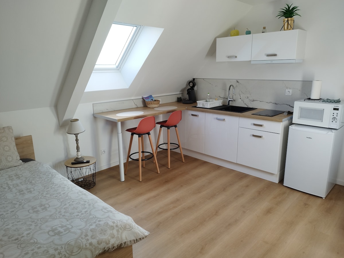 Studio individuel tout confort en pleine réserve naturelle du platier d'Oye, à 12 minutes de Gravelines, et 20 de Calais. Kitchenette avec four grill / micro-ondes, réfrigérateur, plaque induction, cafetière Senseo. Salle d'eau ouverte et WC séparés, Canapé-lit 160x200, calme assuré, et parking privatif fermé. WiFi (fibre ), vous trouverez une TV connectée avec Chromecast intégré, cour reservée au studio avec barbecue et salon de jardin pour les beaux jours.