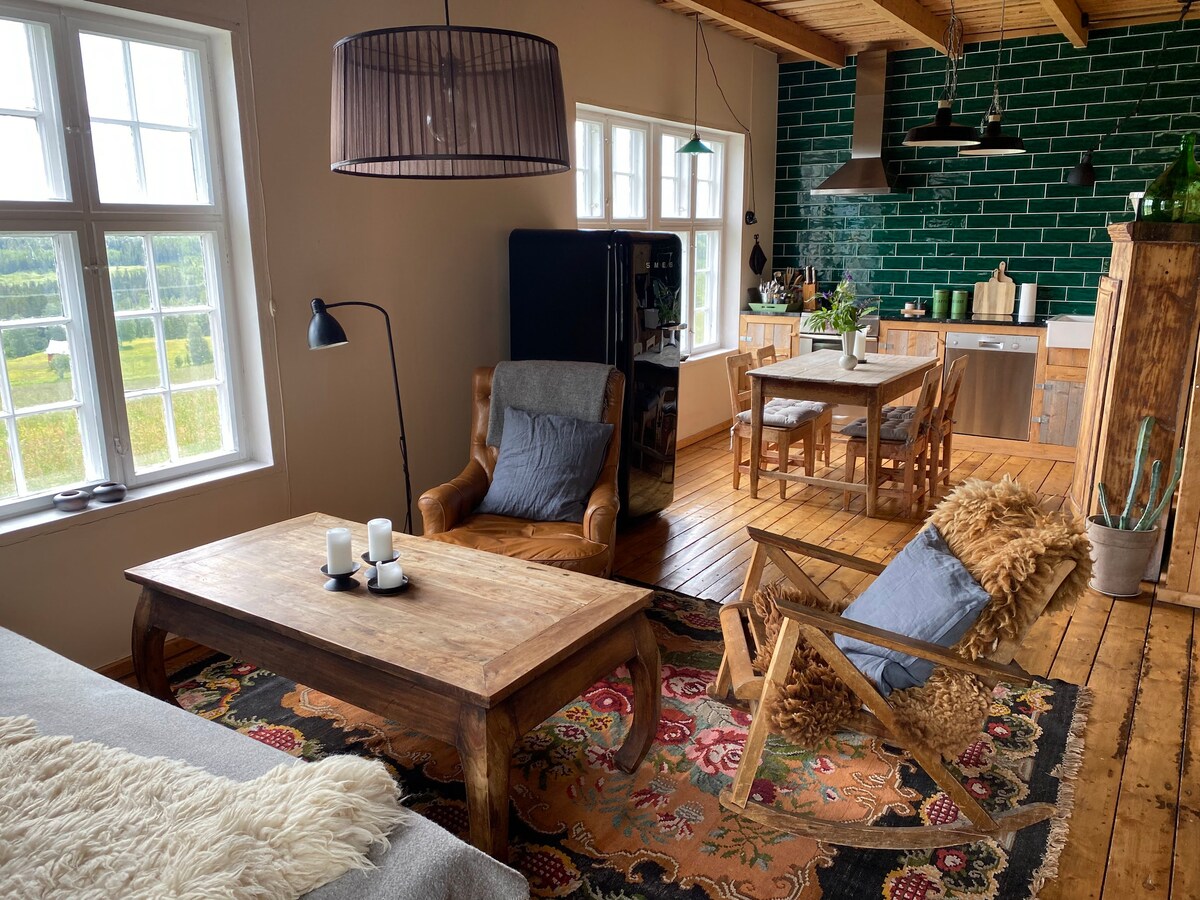 Cozy and stylish apartment in a converted old barn on our traditional Norwegian farm. Nestled in the heart of the Norwegian countryside. From the windows, you’ll enjoy a stunning view of a picturesque valley, with open fields and forests stretching across the landscape. Come and experience the perfect blend of rustic charm and modern comfort on our farm. The apartment features recycled materials and solar panels for green energy year-round. Welcome! #Laavely_snertingdal