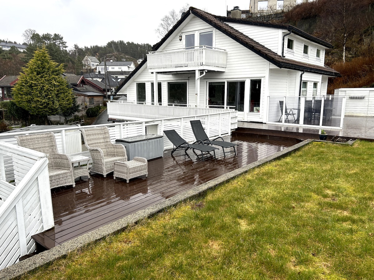 Experience paradise in our spacious home with a sea view. Enjoy panoramic vistas, fish on our shoreline, and unwind in the jacuzzi. Three bedrooms with comfy double beds, sleeping 6. Terrace with stunning sea views. Regardless of weather, bask in the sun or witness nature's might. House is peacefully located at the end of a private road. For ultimate tranquility, retreat to the gazebo at the edge of the terrace, by the sea. Just 30 minutes by car to Bergen city center.
