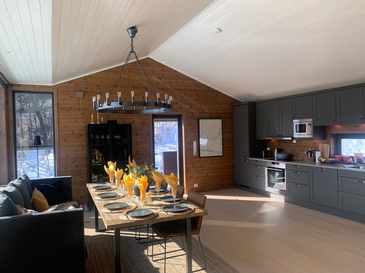 Moderne hytte i 5-10 minutter gåavstand til sentrum, butikker, skisenter og buss. Langrennsløype rett utenfor. Familievennlig og idyllisk. To parkeringsplasser utenfor. Stor stue med åpent kjøkken, spiseområde med god plass til 8 personer, moderne peis og lounge-område med sofa og panoramavindu. TV-stue og bod. Master soverommet med dobbeltseng (160 cm) . To andre soverom har familiekøye (120 og 80 cm bred). 2 sengeplasser i TV-stue innenfor stua. To komplette bad med dusj og varme i gulv.