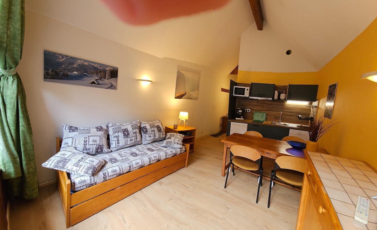 Ce logement paisible offre un séjour détente pour toute la famille.Environ 35 m2, disposant d'une chambre parentale avec 2 lits de 90*2.00 rapprochables. Au dessus, nouveau cette année!, petite chambrette avec velux avec 2 lits de 80*200 accessible avec échelle meunière. Salle de bains et WC séparés. Le séjour avec cuisine équipée, plaque de cuisson, lave vaisselle et frigo, micro ondes. Canape pour coucher 2 personnes supplémentaires, grand balcon donnant sur le cœur station, Esf, commerces...