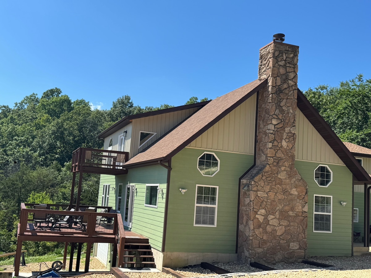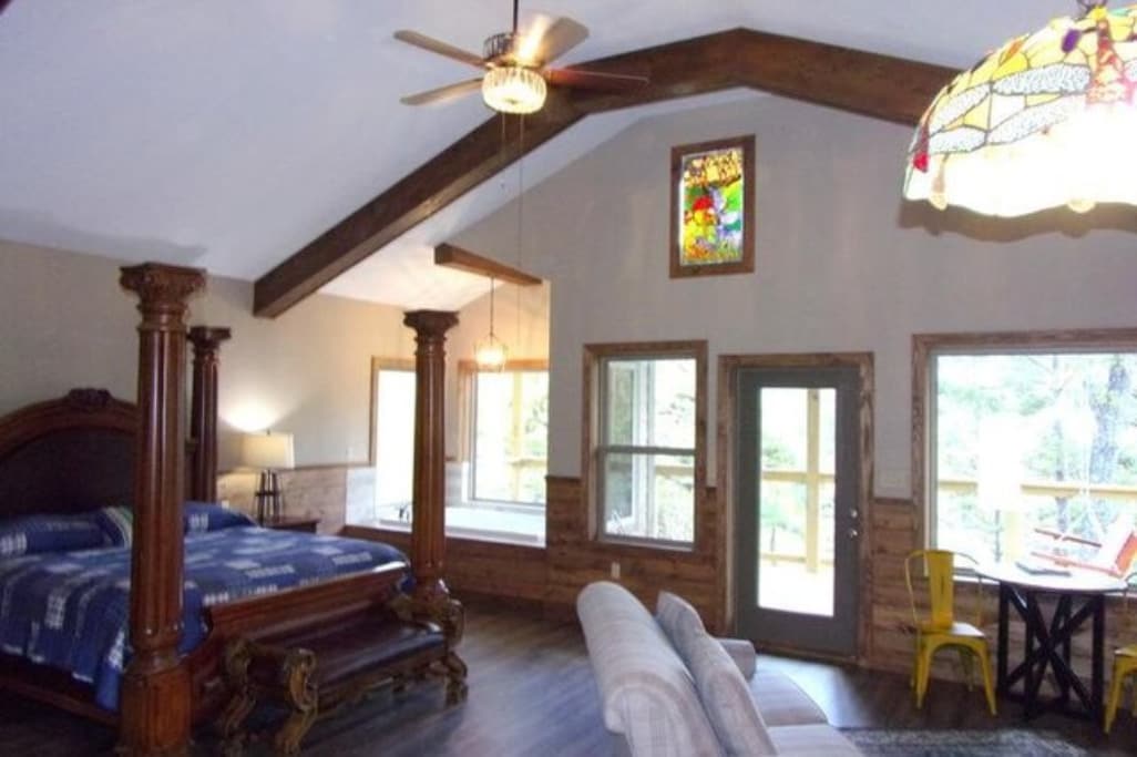 The Ozark Hideaway is on 90 wooded acres 8 mi from Gainesville, MO (home of Hootin-n-Hollerin) in Ozark County on a well-maintained gravel road. Wildlife abounds as you hike the marked trails or warm by the fire pit. The cozy living room offers a gas fireplace. Sleeping space includes a queen bed in the beautifully furnished bedroom, a couch in the living room, and a twin bed in the loft. There is a fully-equipped kitchen. The spacious bathroom has a walk-in shower & washer/dryer.