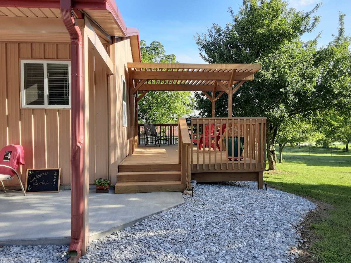Take it easy at this unique and tranquil getaway. Centrally located between Springfield and Branson in the quaint town of Ozark. We are located two minutes from the town square but you will enjoy our country setting. We are surrounded by woods and pastures so you can relax, unwind, enjoy nature, spot wildlife, and rest under our covered patio. We have a washer/dryer. King bed, Full bed, and sofa. Fully stocked kitchen. Plenty of outdoor seating. Fire pit to enjoy with wood provided.