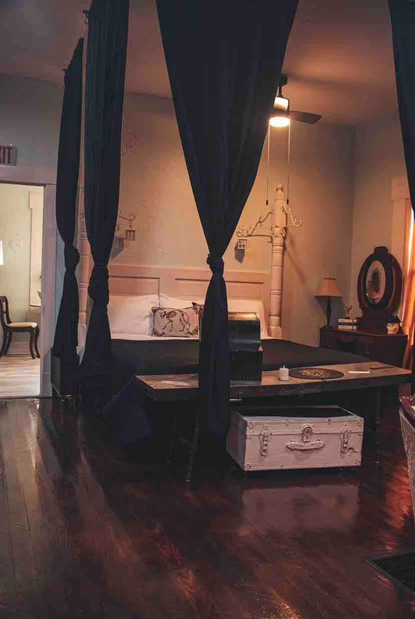 Welcome to the Historic Morgue! An eerie ambience greets you upon arrival..the history runs deep for this building. This antique, nationally recognized, historic building offers antique decor with a modern twist! Morgue decor throughout, rightly so..paying homage to its dark history. This is a loft setting offering a king bed, full size bed, twin and an antique settee(possibly suited for a small child). A large kitchen with small breakfast seating as well as a large table! And that bathroom!